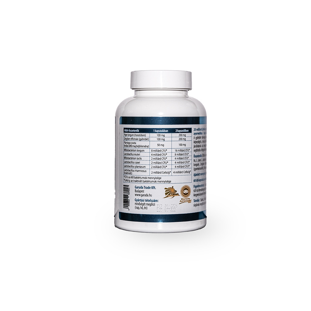 Composition: probiotic strains [B. longum, L. reuteri, B. lactis, L. casei, L. plantarum, L. rhamnosus (inactivated)], Piper longum (long pepper), Zingiber officinale (ginger), HPMC cellulose capsule shell (stomach acid resistant), Plantago ovata (Psyllium husk).