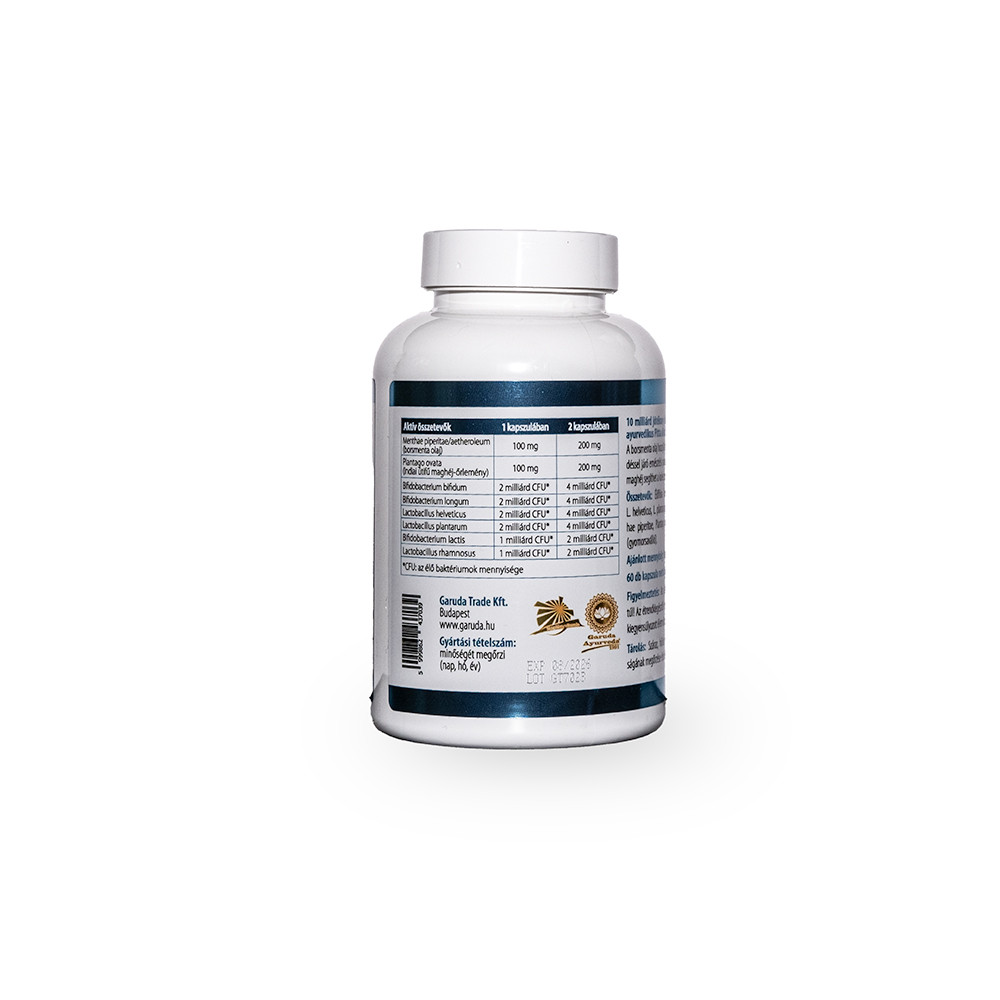 Composition: probiotic strains (B. bifidum, B. longum, L. helveticus, L. plantarum, B. lactis, L. rhamnosus.), Menthae piperitae (peppermint), Plantago ovata (Psyllium husk), HPMC cellulose capsule shell (stomach acid resistant).